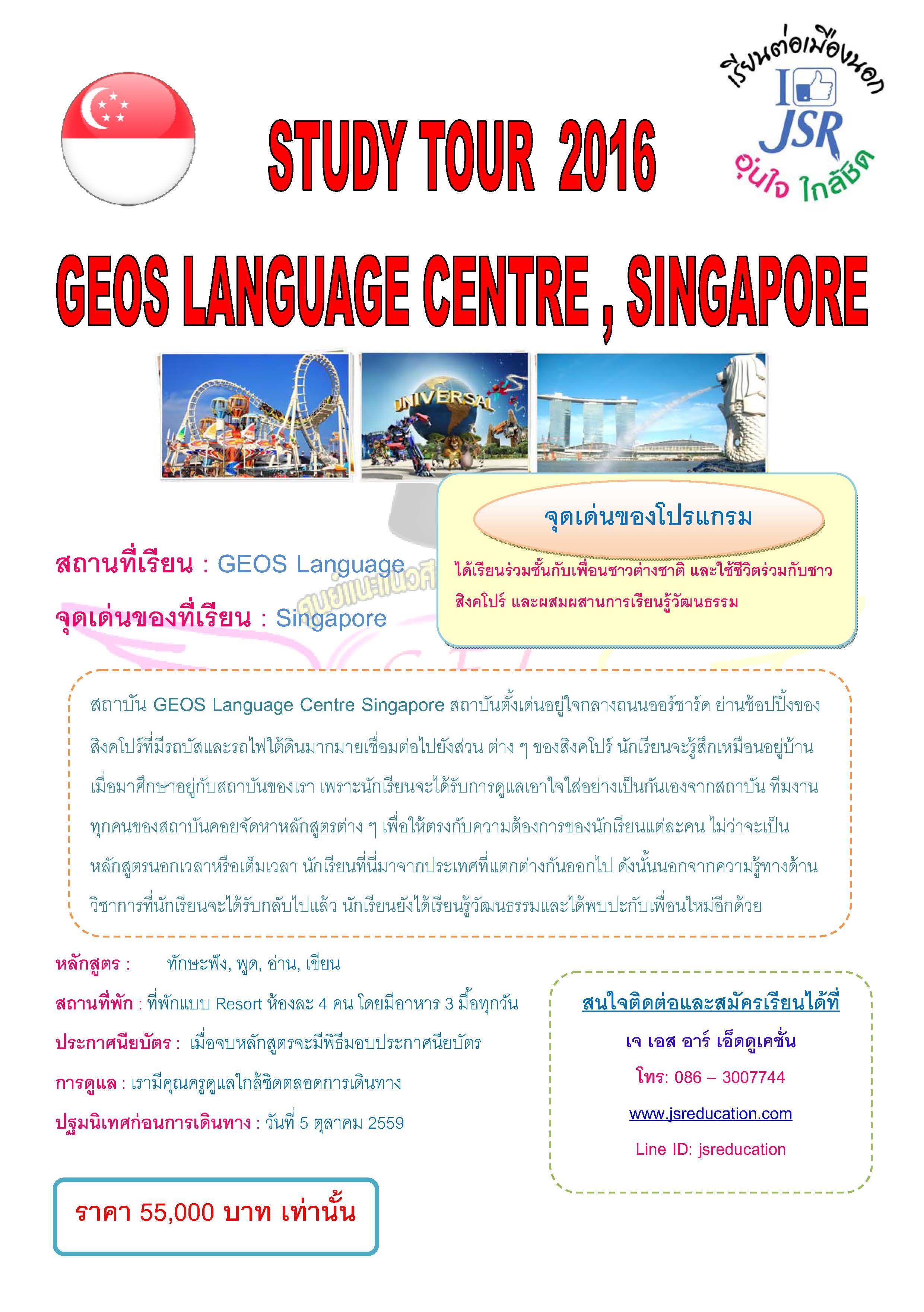 กับโรงเรียนสอนภาษา GEOS Language Centre Singapore น้องๆจะได้เรียนร่วมชั้นกับชาวต่างชาติ ได้เรียนรู้แลกเปลี่ยนวัฒนธรรมกันเพื่อนต่างชาติ พร้อมกับการสนุกสนานไปกับกิจกรรมต่างๆ และการทัศนศึกษาครบสูตร ระหว่างวันที่ 9 - 15 ตุลาคม 2559 ราคาเพียง 55,000 บาท เปิดรับสมัครตั้งแต่วันนี้ถึง 1 ตุลาคม 2559 นี้เท่านั้น!!!